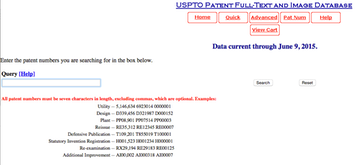 Now, on to the USPTO hoops. First, navigate to the USPTO search engine for patent numbers. If you can’t find it (no surprise there), as of 2015, try this link. It should take you here: